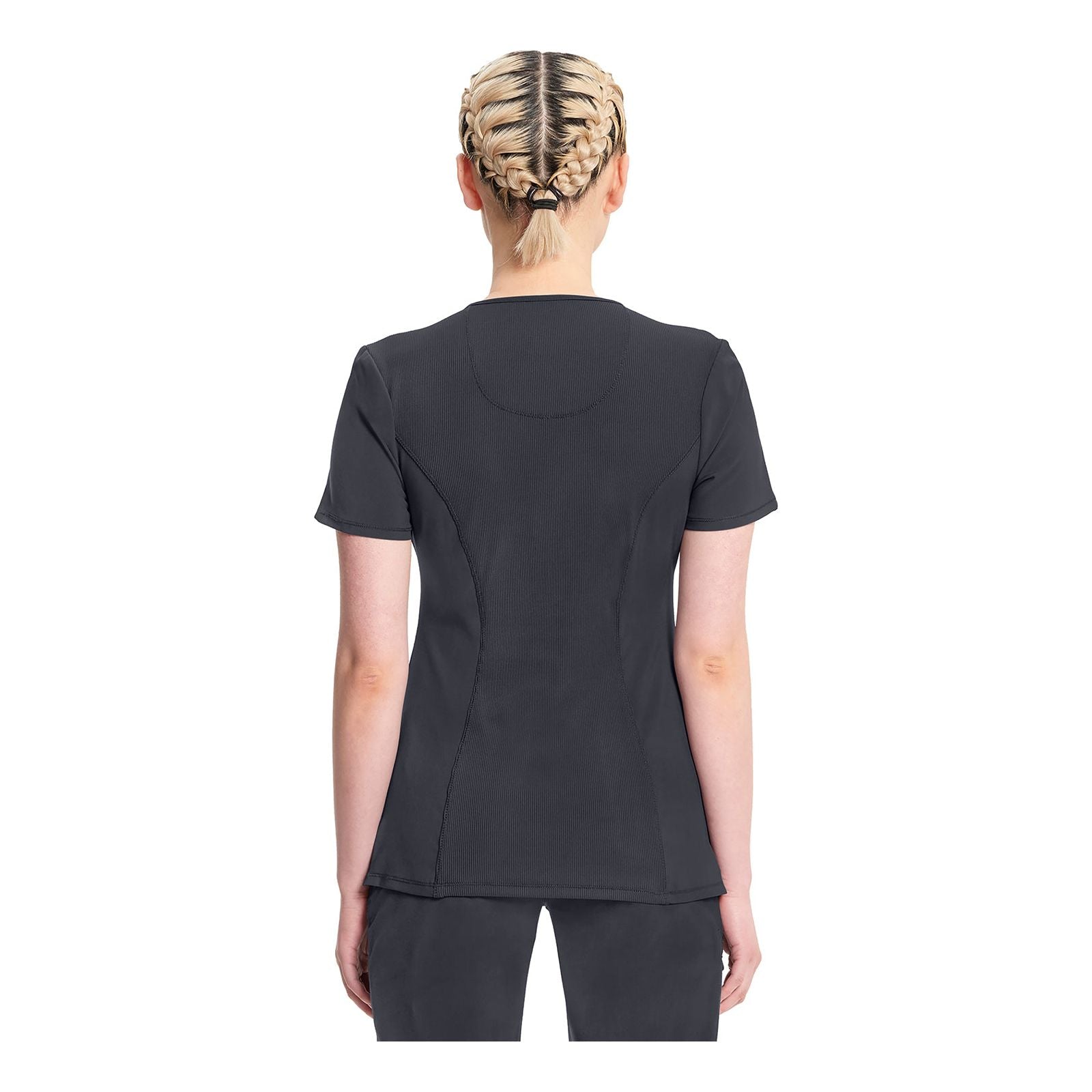A Contemporary fit round neck top with a rib-knit inset at the front neckband also features shoulder yokes, a bungee ID badge loop on the right shoulder, front and back princess seams, two patch pockets, one interior pocket, and side vents. Stretch rib-knit at the center back panel gives this top its slimming shape and allows for extra movement and comfort. Coverstitch detail throughout. Center back length: 26". The comfortable stretch poplin fabric and super stretchy rib-knit is the perfect combo for healthcare professionals.