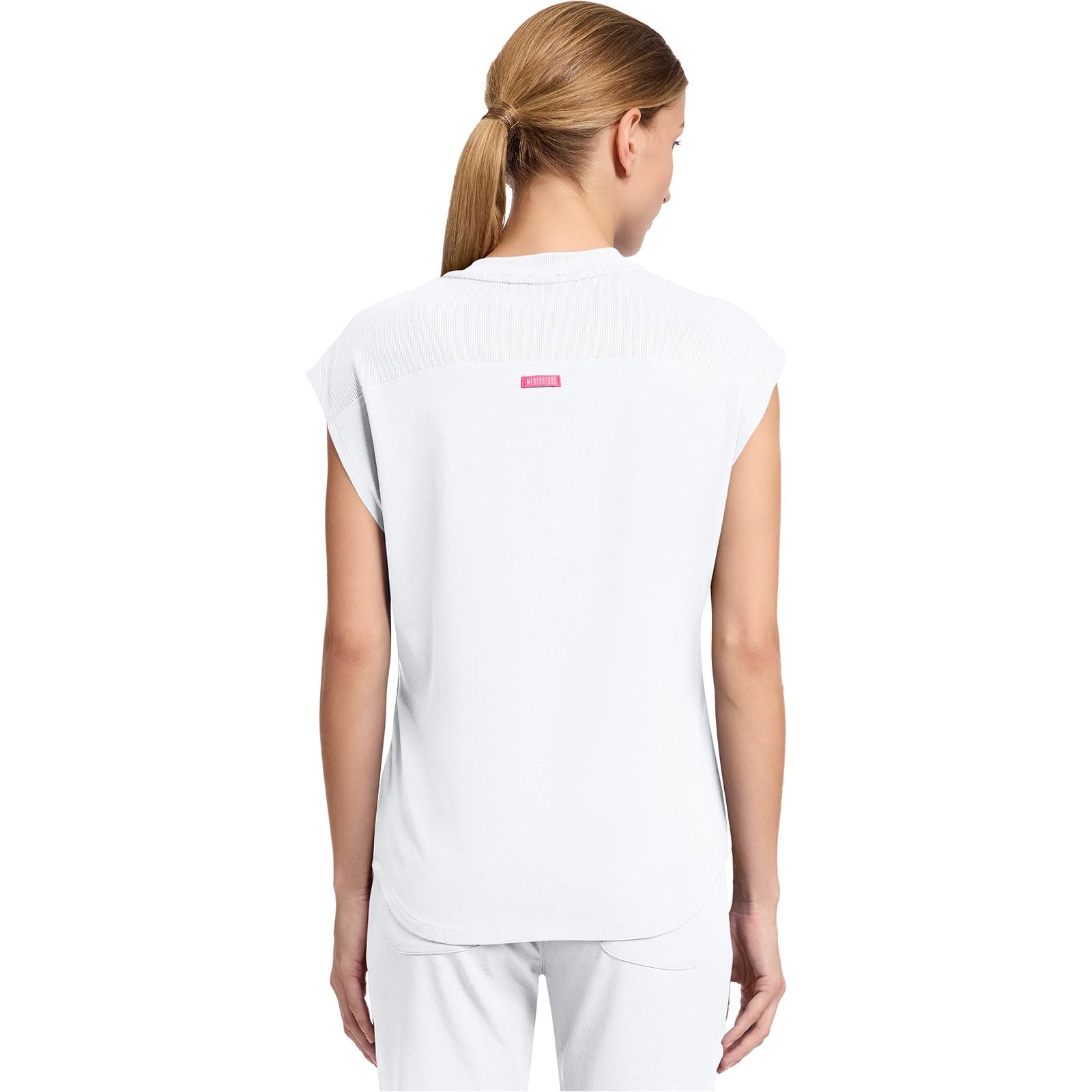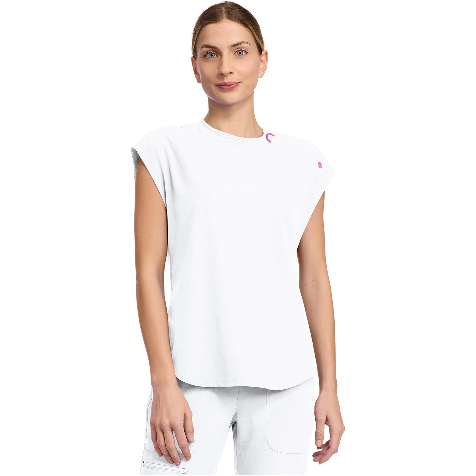 Trend alert: this Missy fit round neck tuckable top is filled with fashionable details such as dyed-to-match rib-knit neckband trim plus dolman sleeves with rib-knit insets at the armholes. There is also a bungee ID badge loop on the wearer's left side of the neckband. There are two zipper pockets for secure storage: one wireless earbuds pocket at shoulder seam and one side seam pocket on the wearer's left side. The dyed-to-match rib-knit back yoke provides style and fit. A locker loop is placed below the back yoke for quick hanging. A rounded hem completes the look. Cent back length: 25"