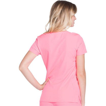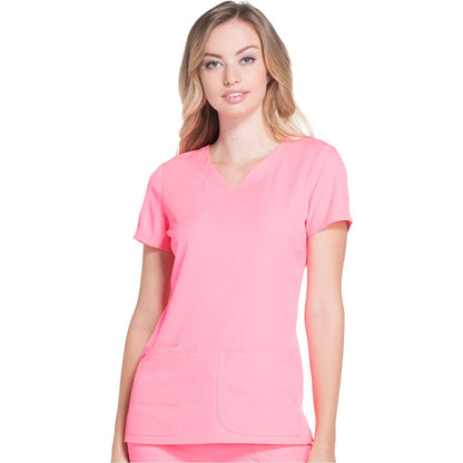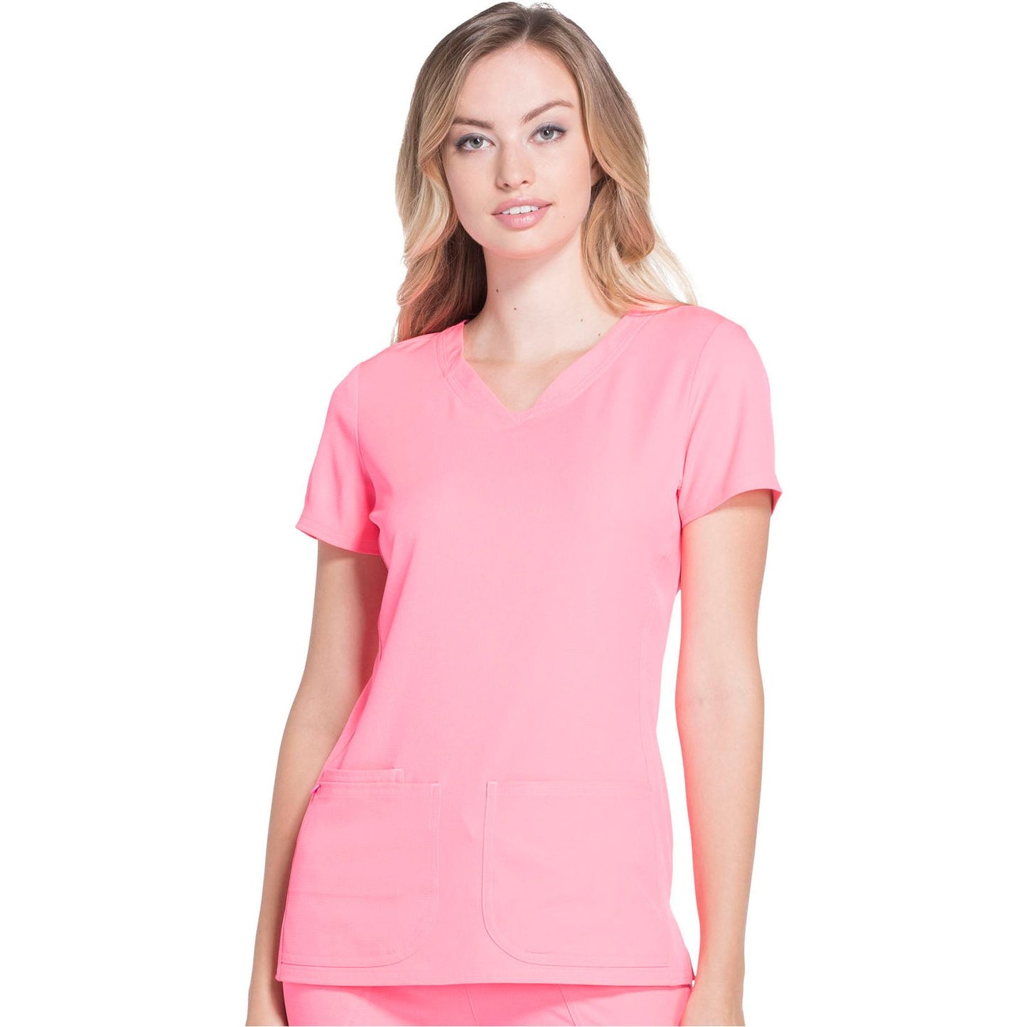 A Contemporary fit V-neck top features rounded patch pockets with a small interior pocket, an exterior pink bungee loop and a hidden functional pink grommet and bungee loop to thread headphone cords through the inside. Also featured is double needle topstitching, a signature woven tape at the back neck, front and back princess seams and side vents. Center back length: 25 1/2".