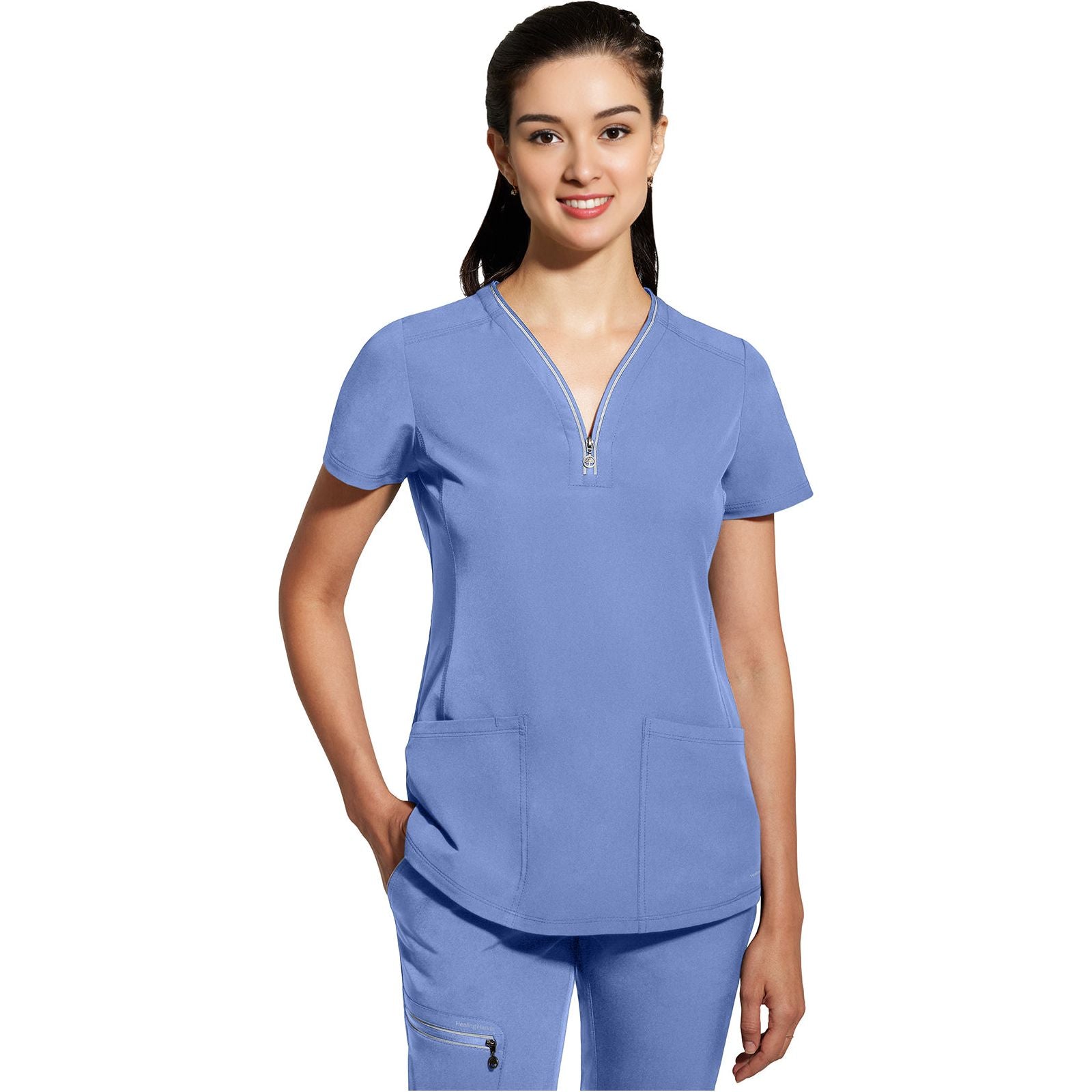 Yoga Knit V-Neck Top features 2 potch pockets. Slimming knit side panels gives a better fit. Grosgrain ribbon and grommet details adds charm to this top.