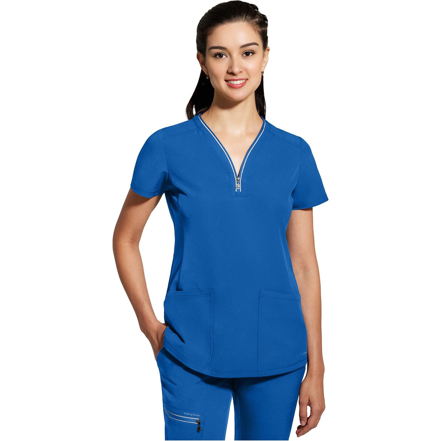Yoga Knit V-Neck Top features 2 potch pockets. Slimming knit side panels gives a better fit. Grosgrain ribbon and grommet details adds charm to this top.