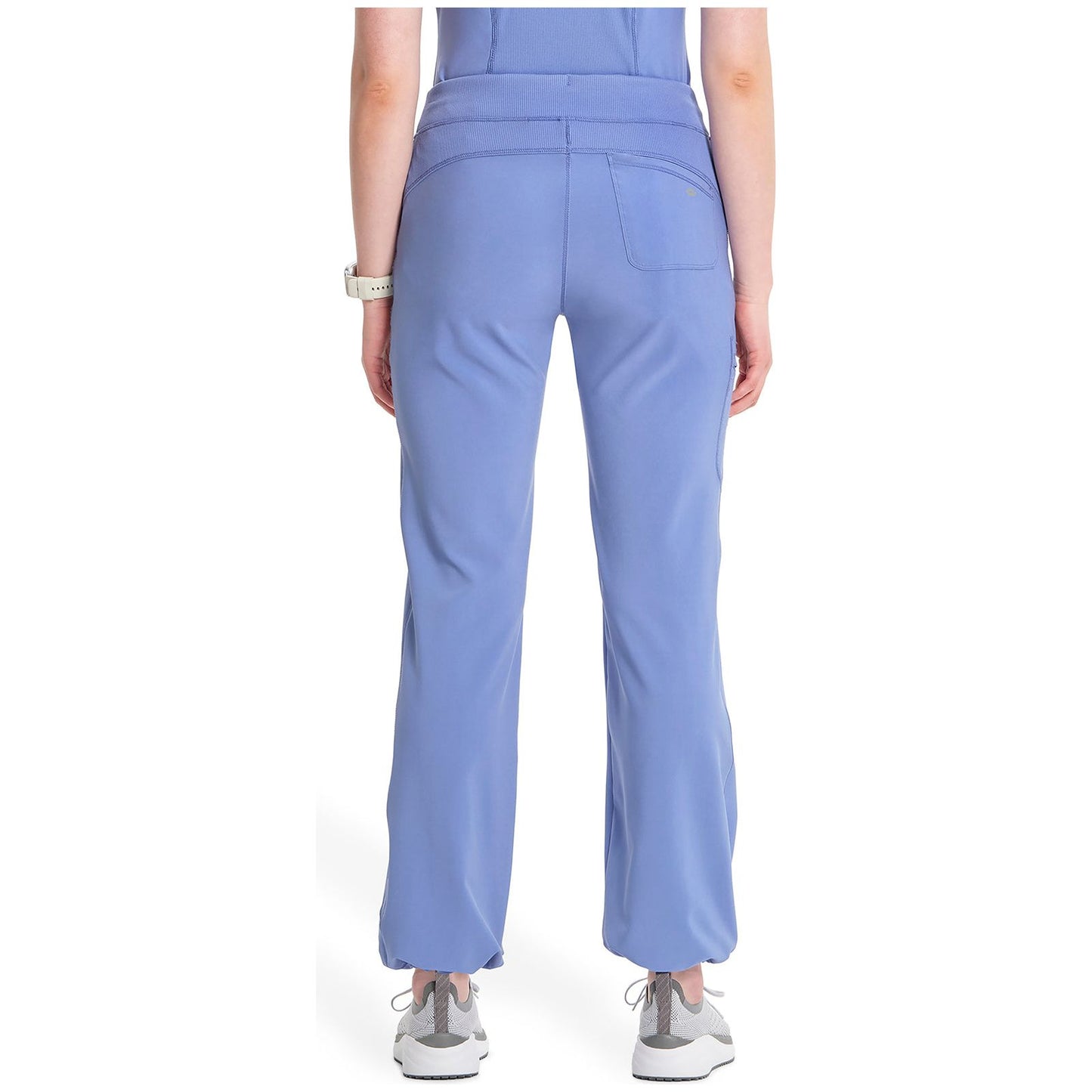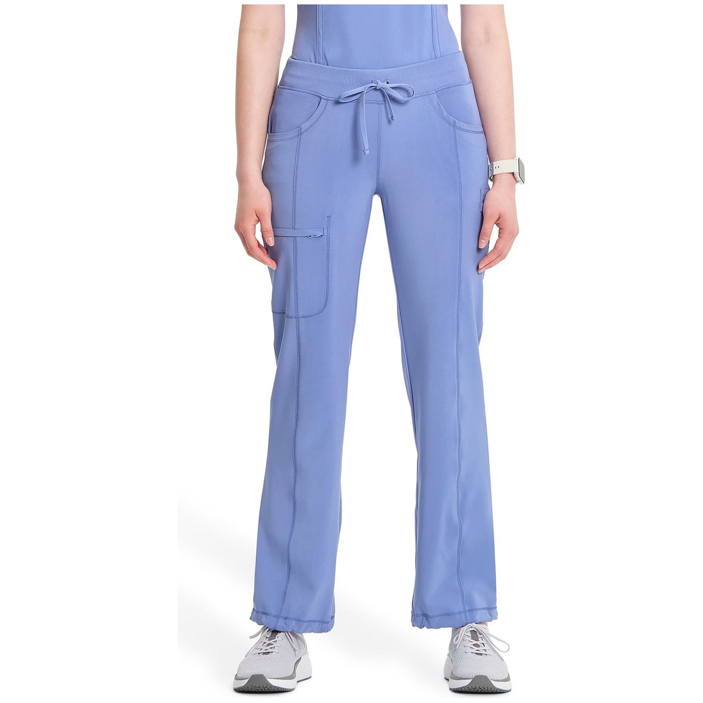 A Contemporary fit, low rise, straight leg pant features an elastic knit waistband and adjustable drawstring. Also featured are rib knit front and back yokes, angled front pockets, front leg seams with a zip closure cargo pocket, one back patch pocket, a bungee instrument loop below left pocket, a bungee cord with a toggle at the leg hems for adjustability and coverstitch detail throughout. Inseam: 31" The comfortable stretch poplin fabric and super stretchy rib knit is the perfect combo for healthcare professionals.