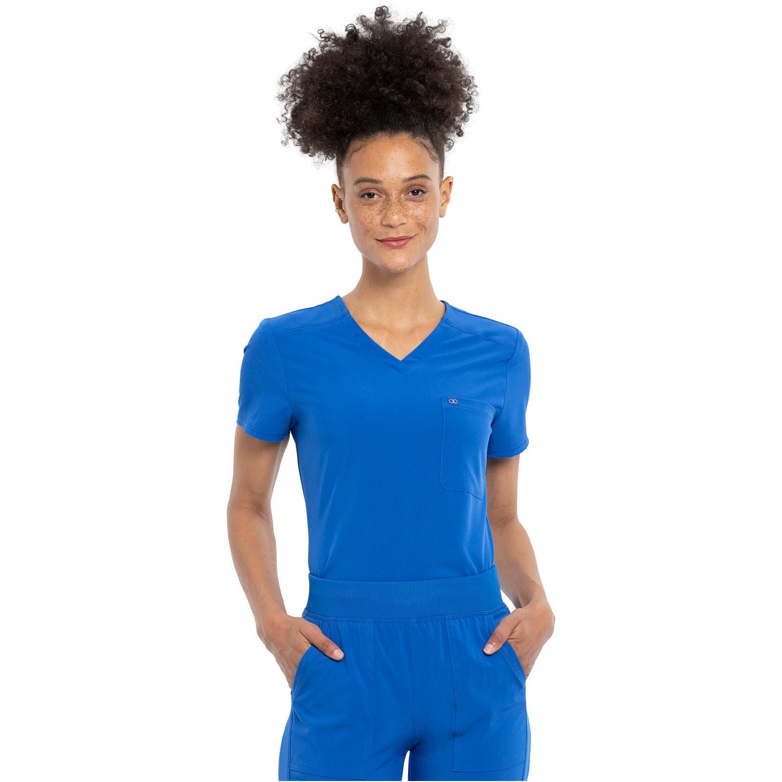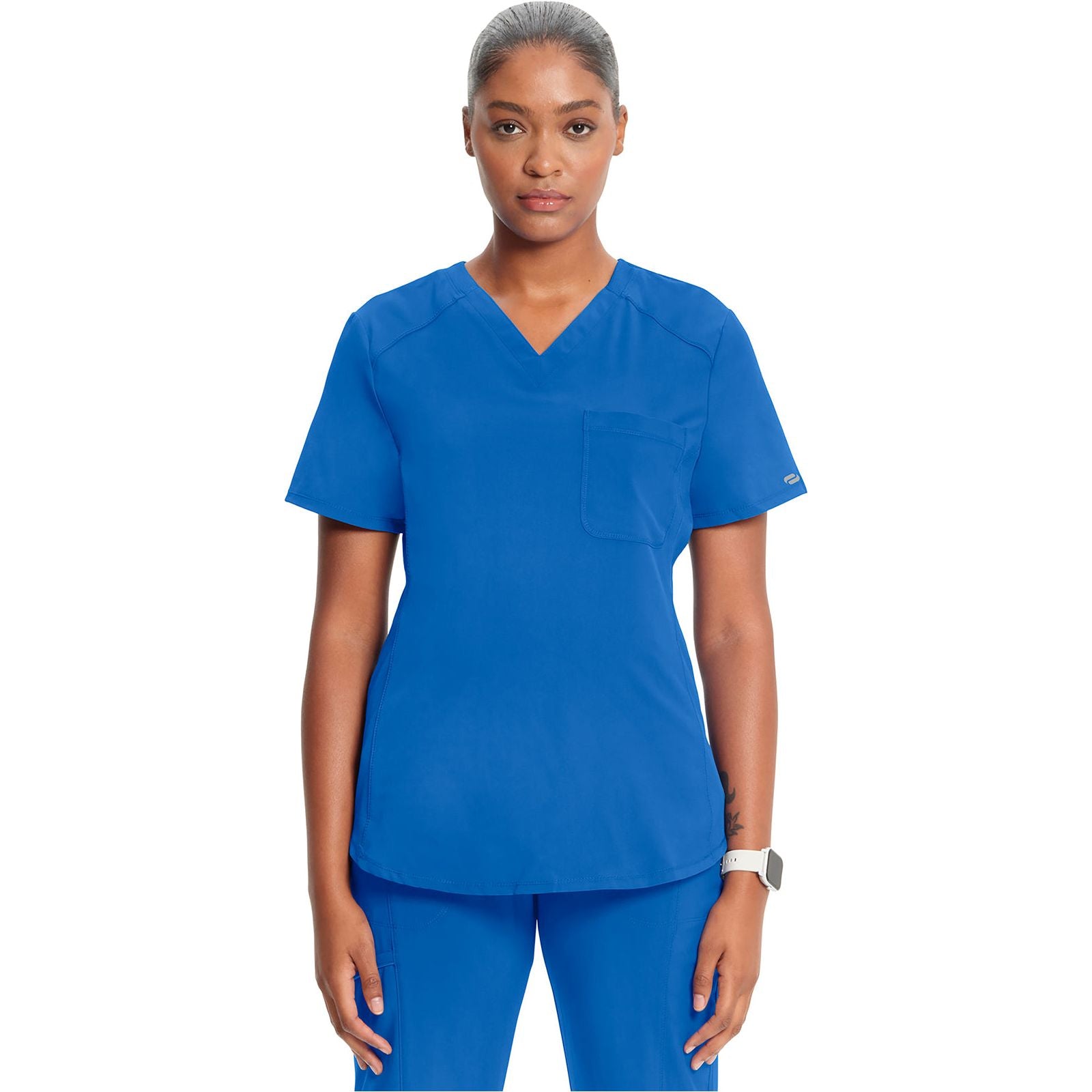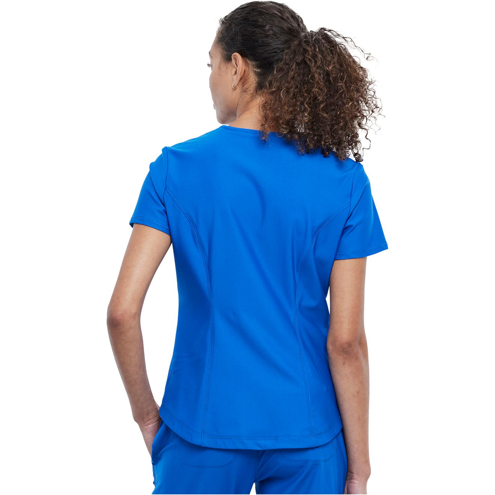 This Contemporary fit V-neck top has rib-knit insets at the neckline. Other features include front and back yoke seams plus front and back princess seams. There is a chest pocket on the wearer's left side. A center back rib-knit panel provides extra comfort and stretch. A shirttail hem and side vents complete the look. This style looks great tucked in or untucked. Center back length: 26"