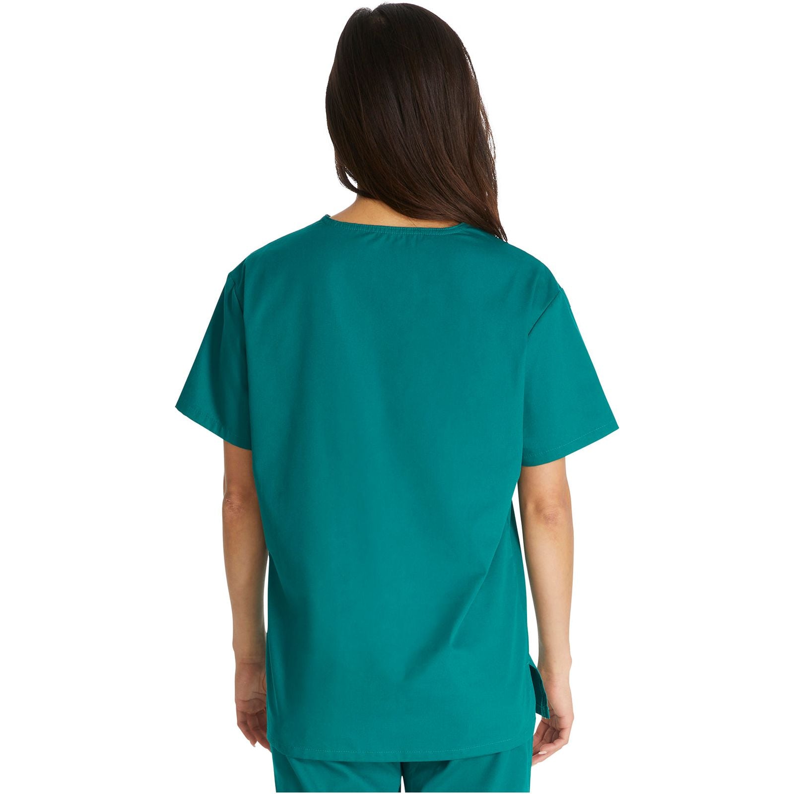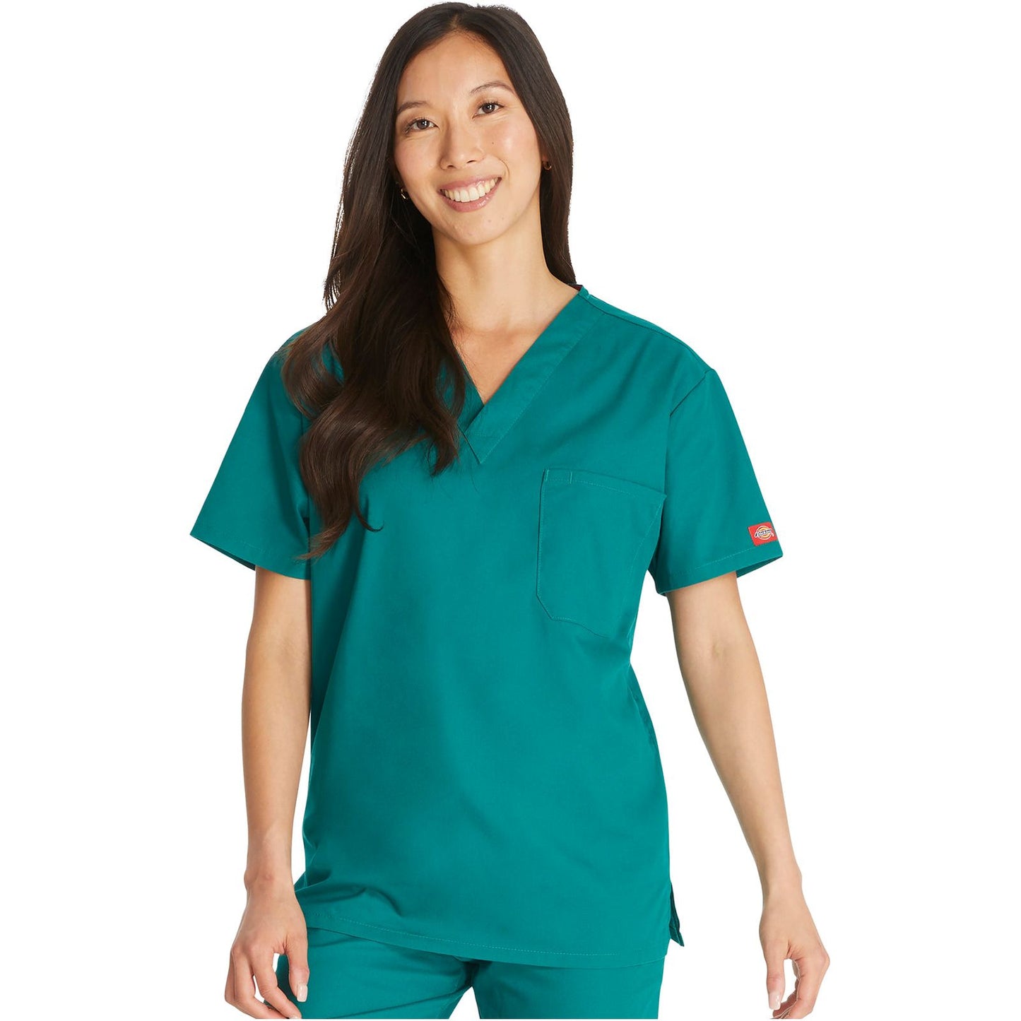 Unisex Fit, V-neck top features Dickies logo twill tape at the back neck, a front chest pocket with a bar-tacked pencil slot and side vents. This style looks great tucked in or untucked. Center back length: 28".