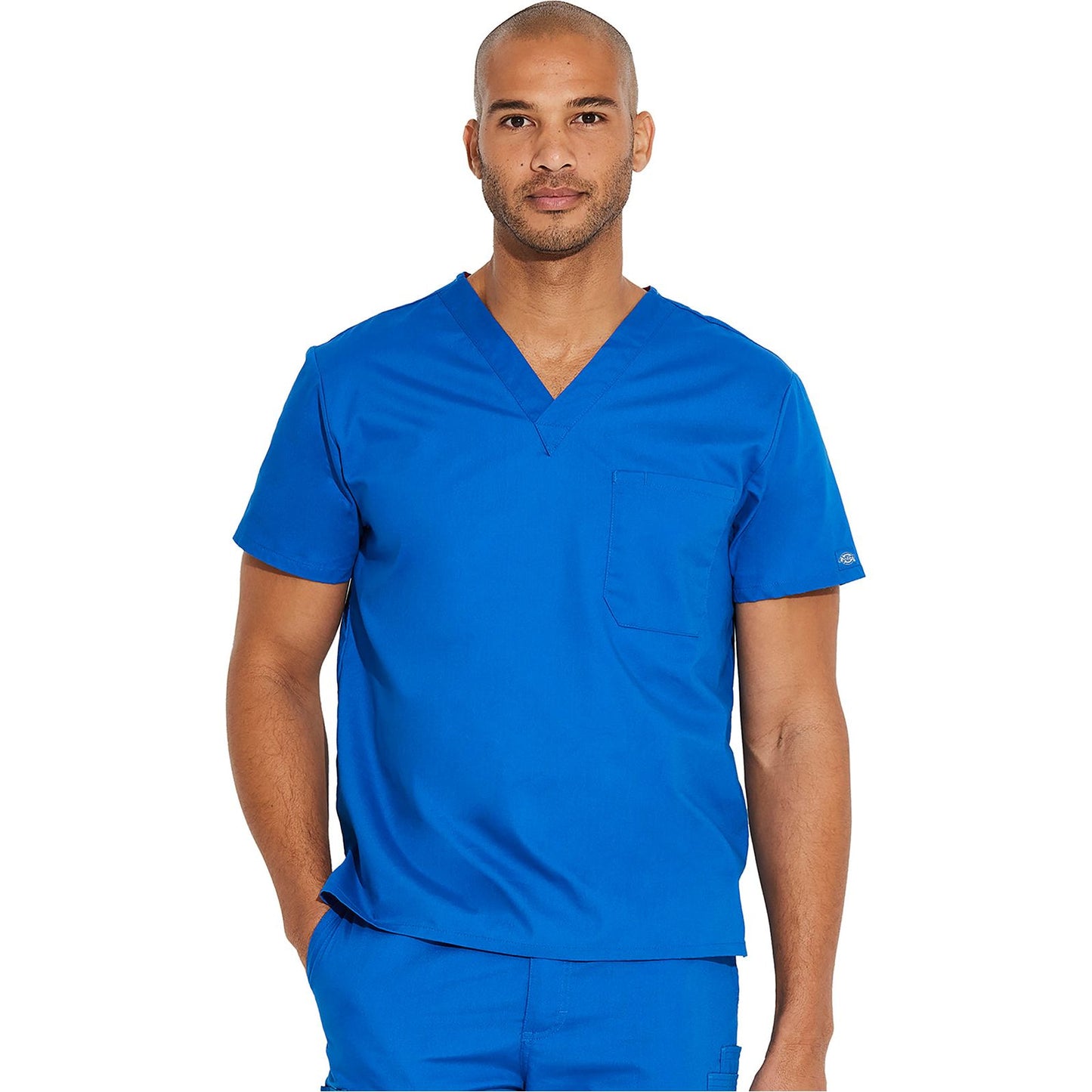 Unisex Fit, V-neck top features Dickies logo twill tape at the back neck, a front chest pocket with a bar-tacked pencil slot and side vents. This style looks great tucked in or untucked. Center back length: 28".