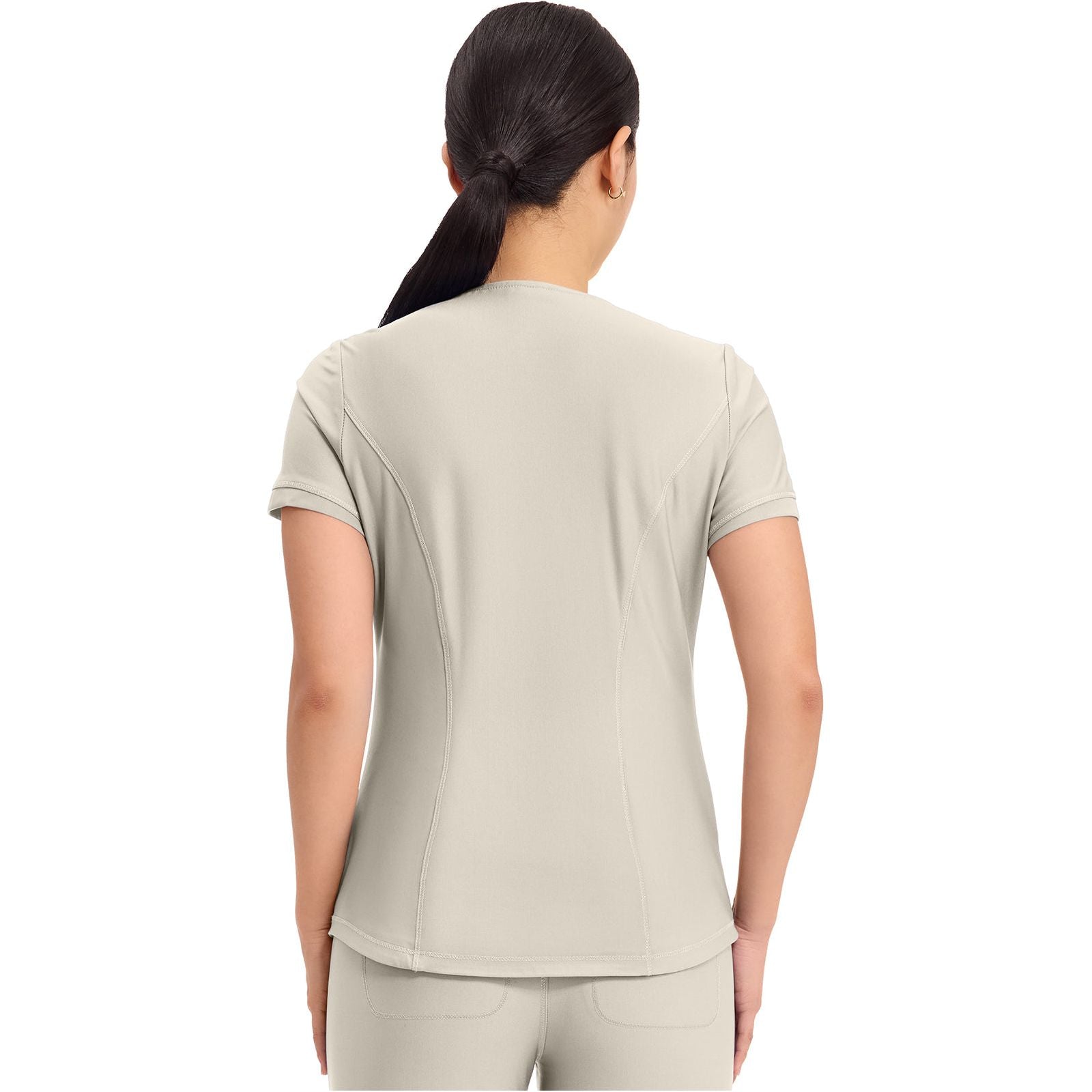 This v-neck top features a curved hemline and a subtle touch of power mesh at the neck band and sleeve hem. It also has generous two front welt pockets, angled front yoke panels, and back princess seams for a form flattering shape. Contemporary Fit. Center Back: 26"