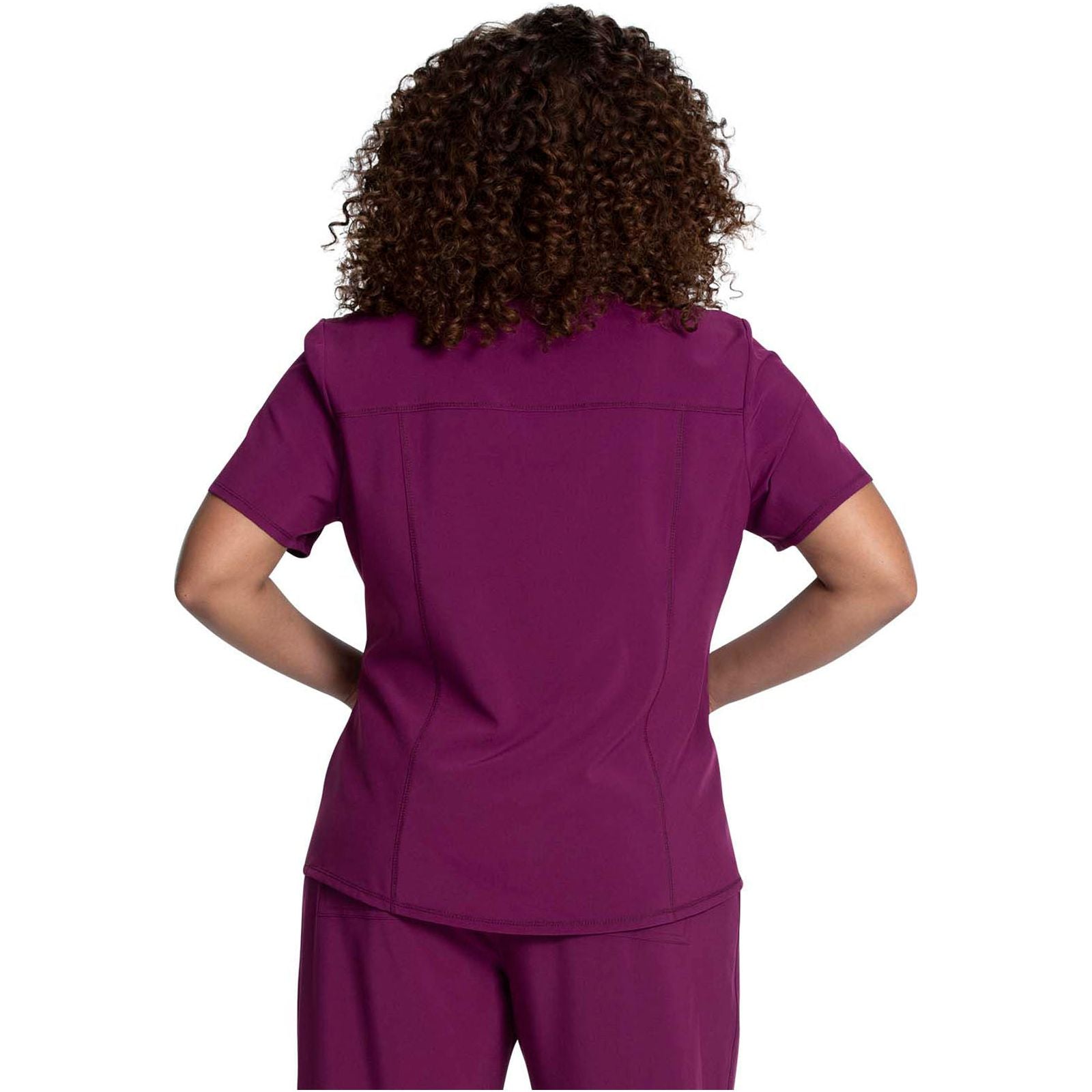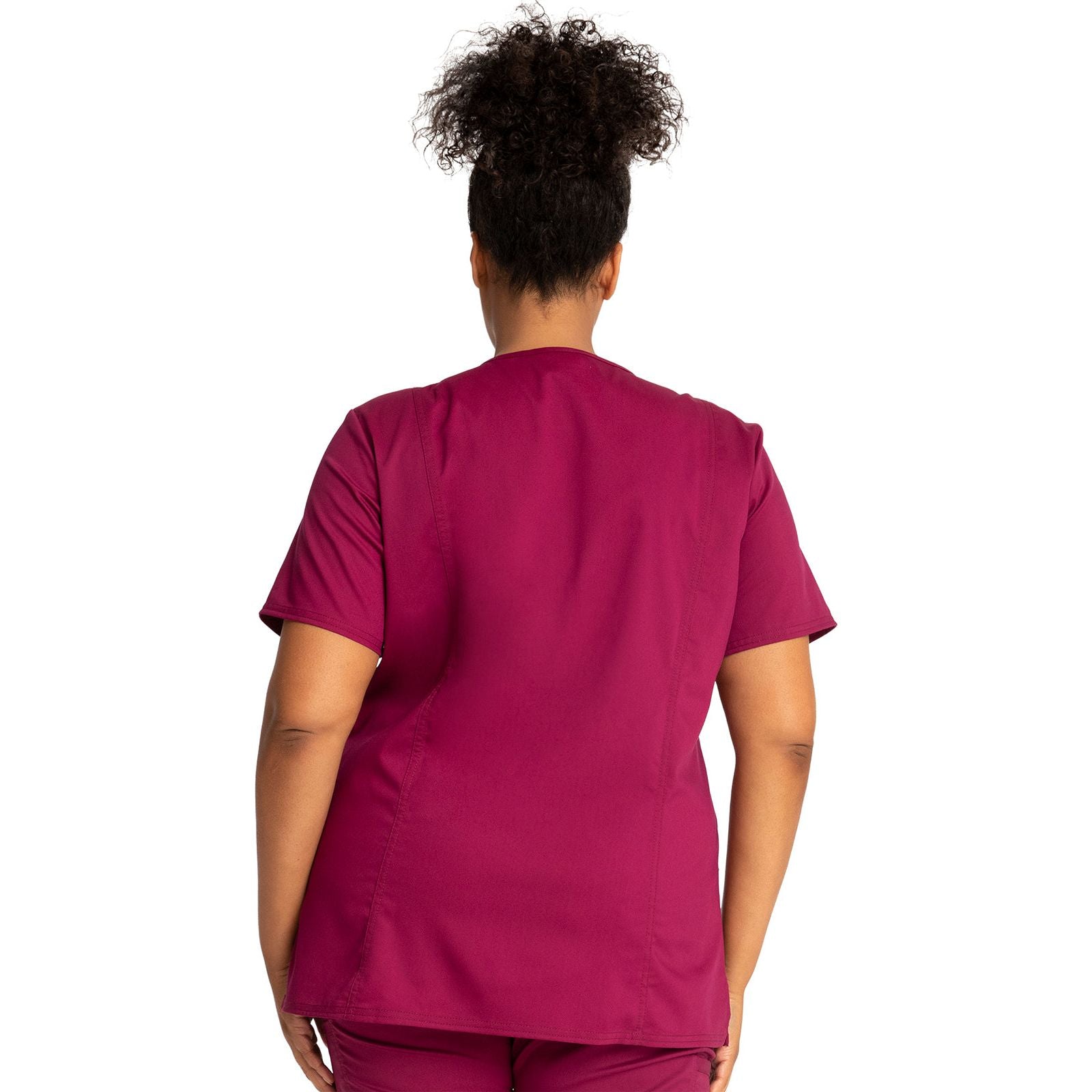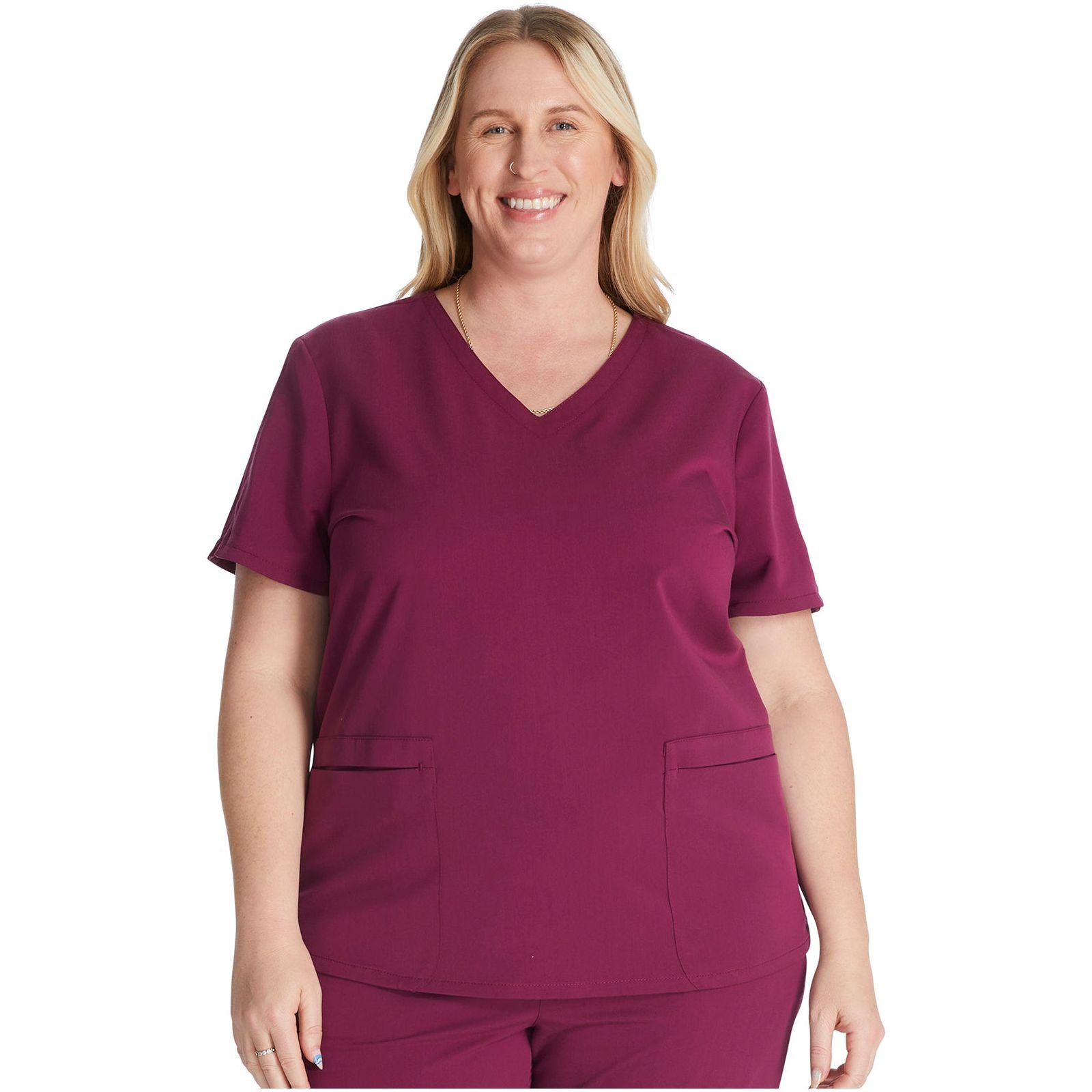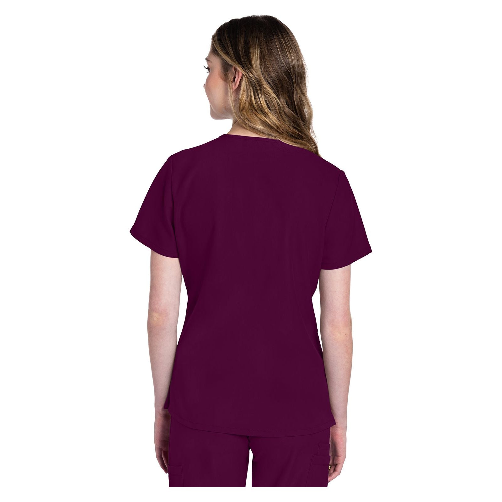 This Contemporary fit v-neck top has power mesh insets at the neckline for comfort and to make the garment easy to put on. Other features include front princess seams, two front zip pockets, and a curved hem with power mesh insets at the side seams for extra mobility. Center back length: 26".