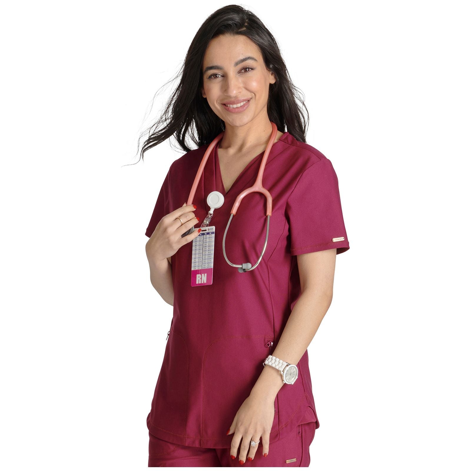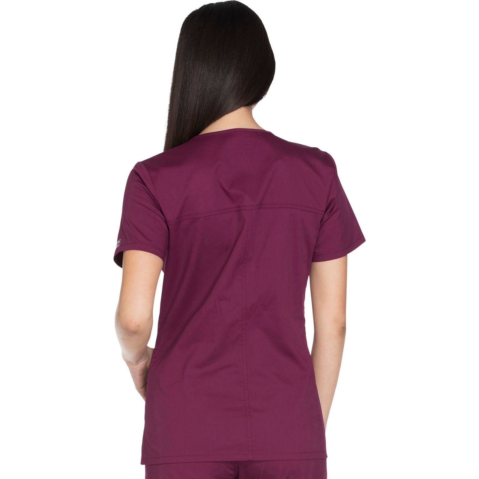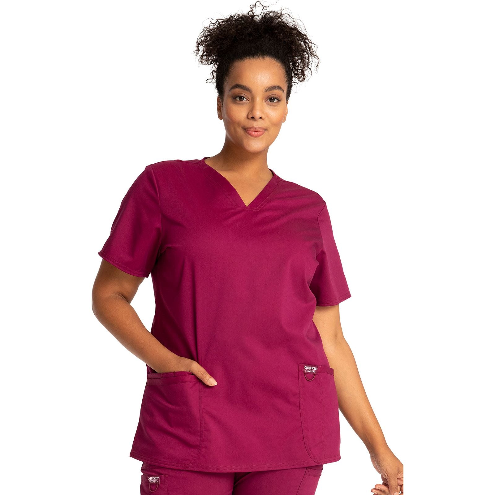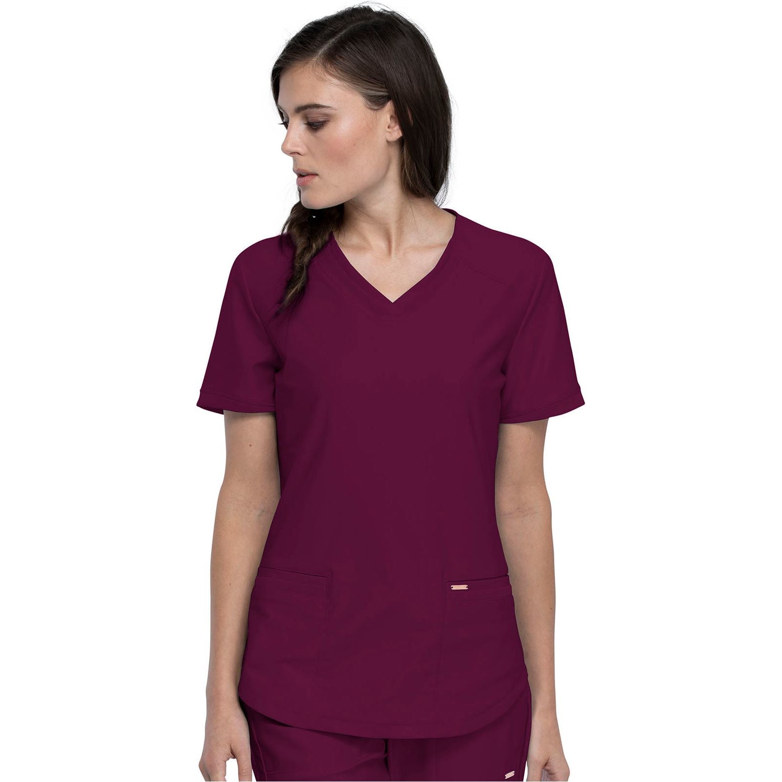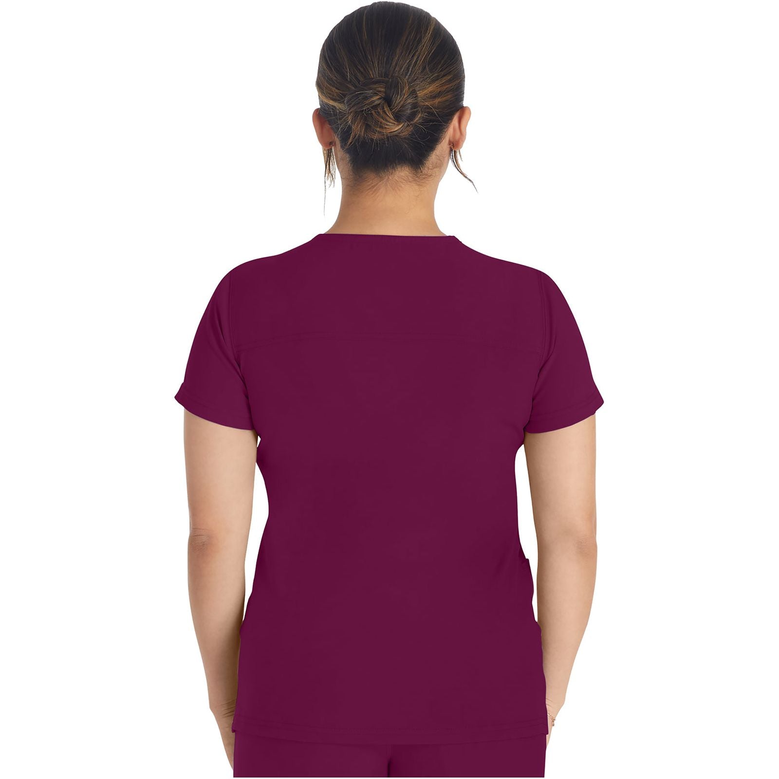 This Contemporary fit v-neck top has power mesh insets at the neckline for comfort and to make the garment easy to put on. Other features include front princess seams, two front zip pockets, and a curved hem with power mesh insets at the side seams for extra mobility. Center back length: 26".