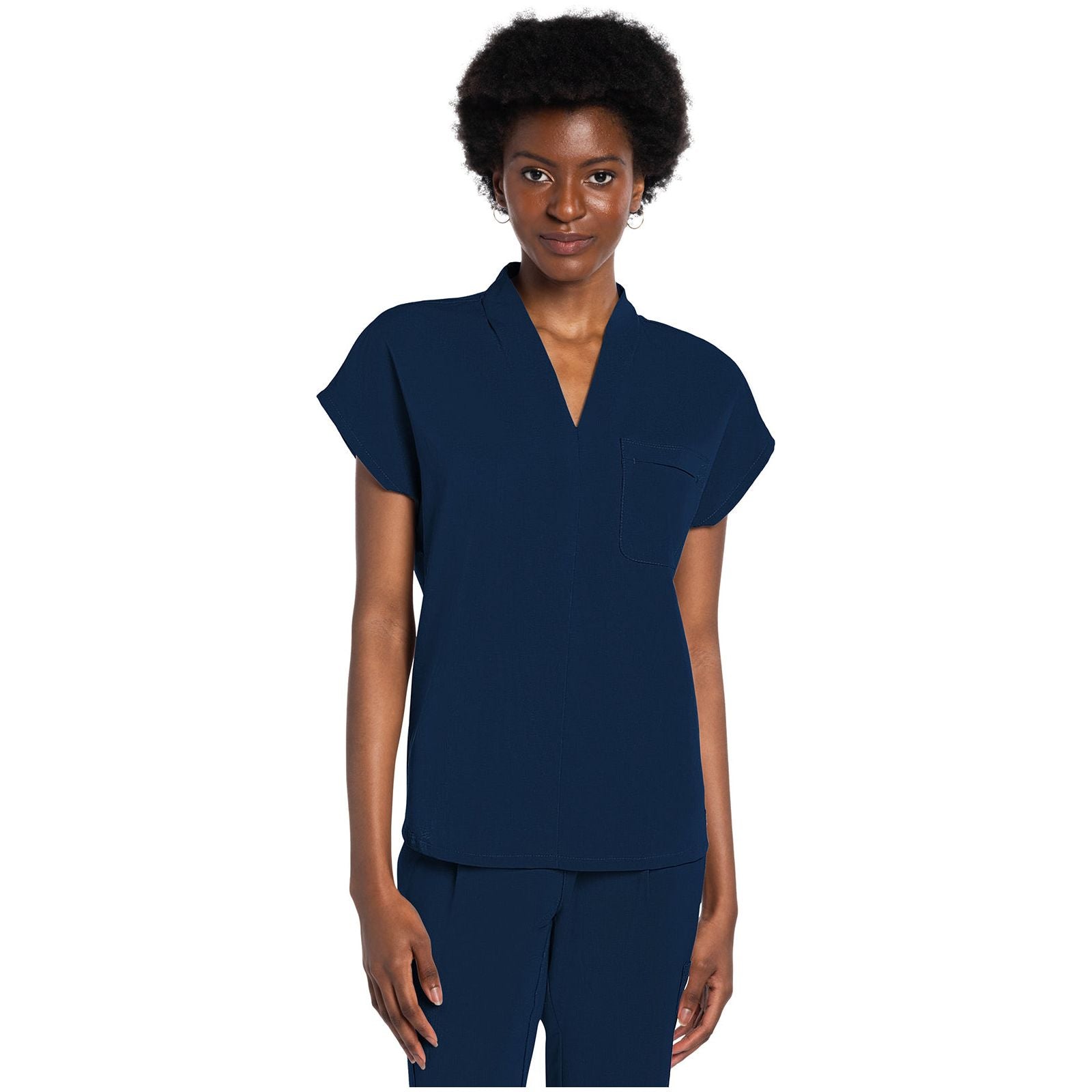 Soft pleats accent the v-shaped neckline of this updated uniform style. There are cropped dolman sleeves, one front entry chest pocket, a curved hem, and center back vent for ease of movement. This scrub top is flattering and professional whether it's worn tucked or untucked. Modern Classic fit. Center back length (size Small): 25"