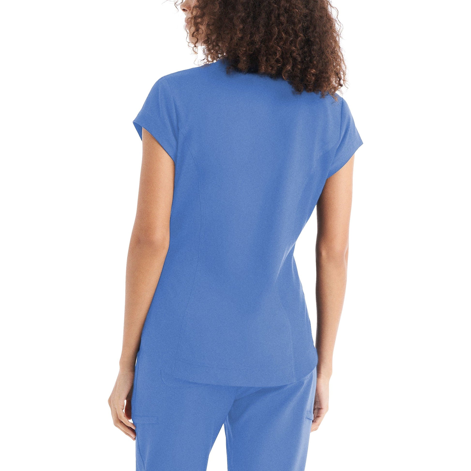 This Modern Fit v-neck top offers a tailored fit with front princess darts and back princess seams. Features a single chest pocket and shirttail hem for an easy tuck-in option. Cap sleeves and back side knit panels offer easy movement and added comfort.