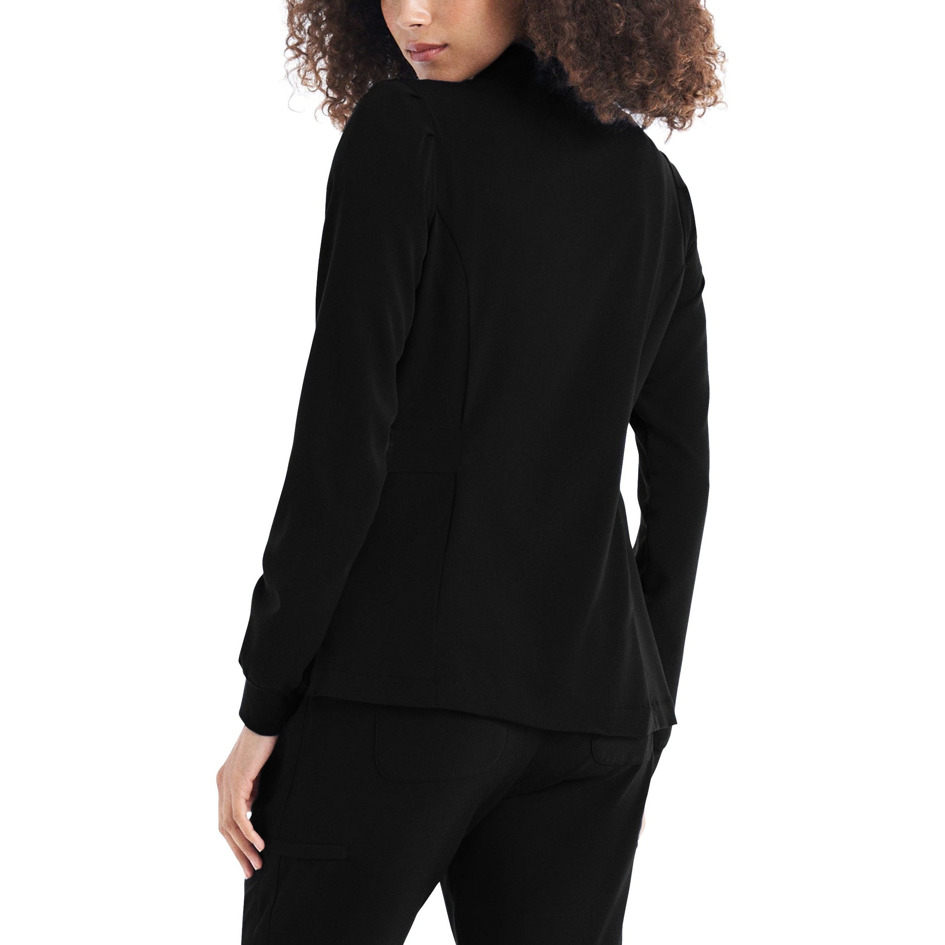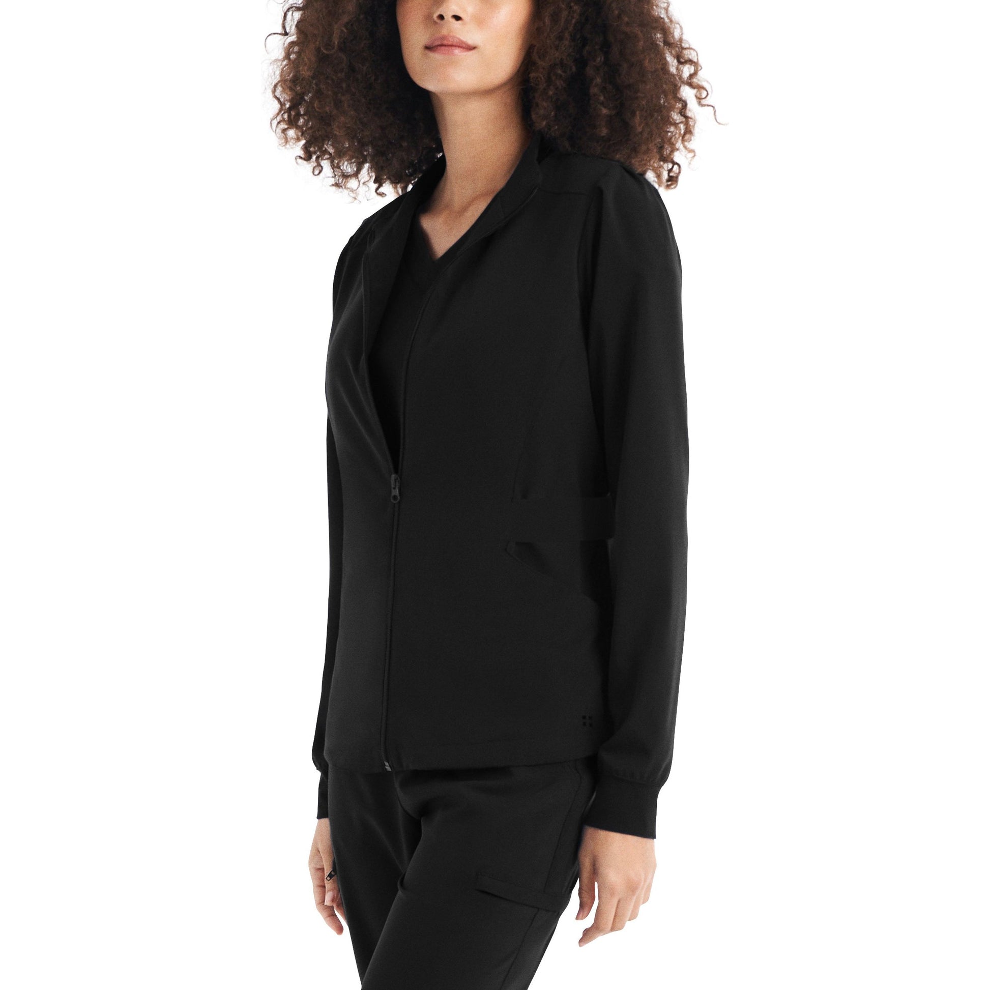 This Modern Fit zip front jacket will keep you stylish in-and-out of the workplace. The mock neck and pleats at the sleeves give this fashionable jacket a feminine touch. Features cozy knit cuffs, front and back princess seams, 2 front pockets, and a hi-low hem detail with side vents for an easy fit.