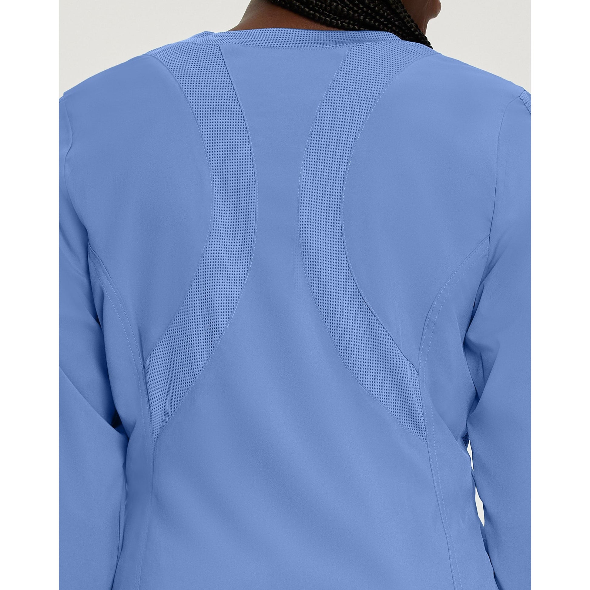 The FIT women's warm-up scrub jacket features a 4-way super stretch for maximum comfort and flexibility. This quick-dry fabric pulls moisture to the surface so your skin feels dry through your most active shifts. This crew neck scrub jacket has a mesh collar, arm cuffs, and detailing, a zip-front closure, and a mesh back for ventilation. Please Note: All sale items are final sale. No exchanges or refunds will be accepted on these items.