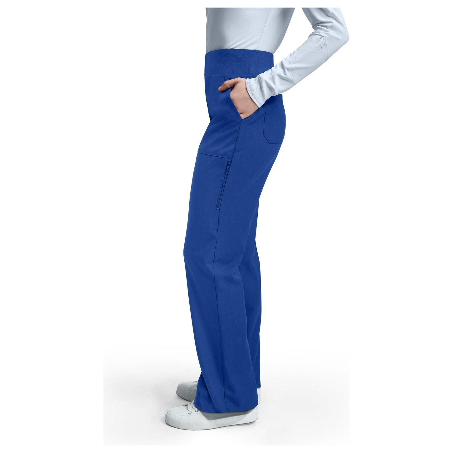Designed for active professionals, these women's pants showcase a wide-leg silhouette that seamlessly blends style with functionality. The sporty design incorporates six pockets, including a convenient zipper cargo pocket. The waistband is thoughtfully crafted with a comfortable knit and an internal drawcord, ensuring both ease and functionality.