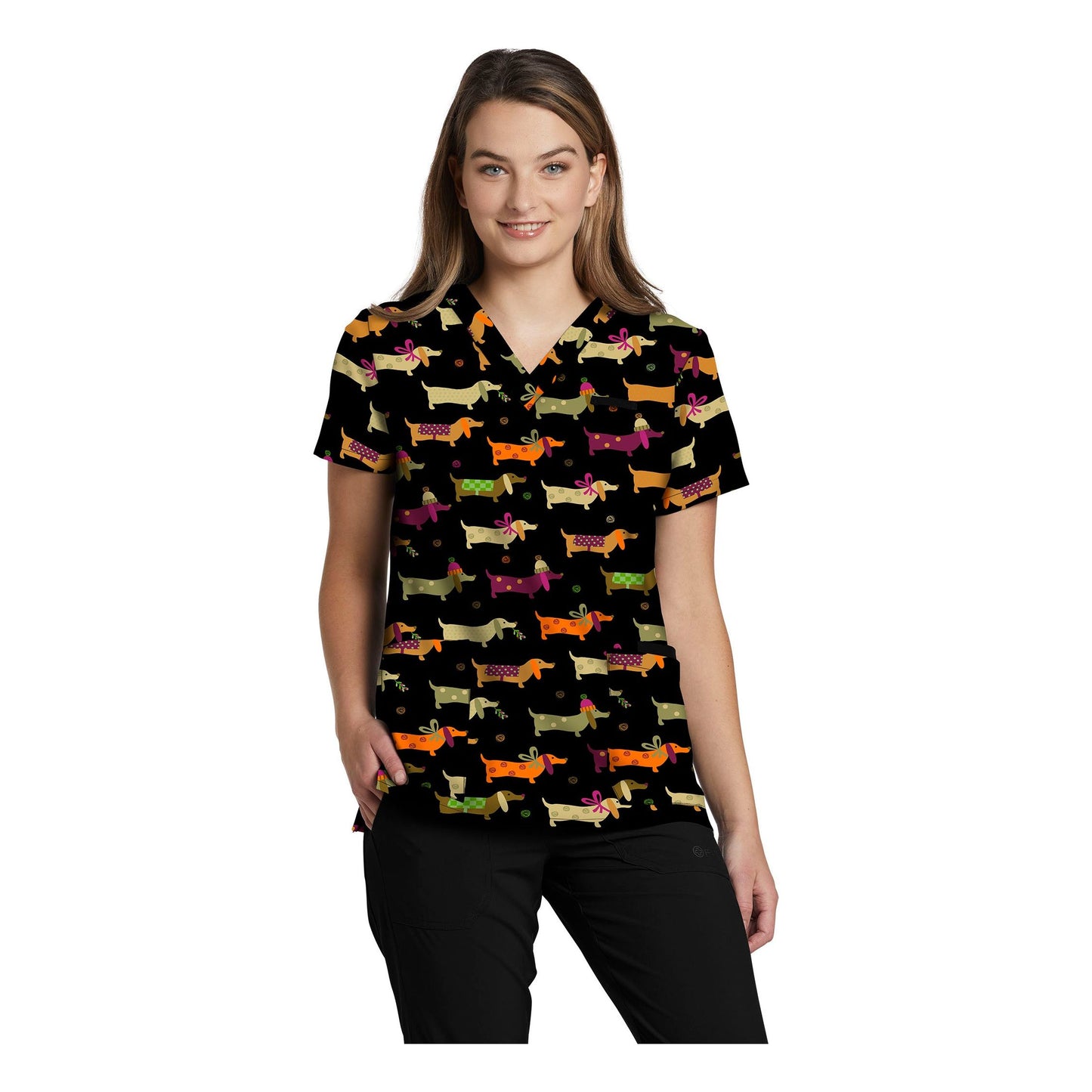 Our women's 3-pocket V-neck scrub top adds both comfort and fun to your work shift with breathable, 2-way stretch for mobility and a silky soft touch for all-day comfort. Created with a V-neck, side vents for extra ease of movement, and a contemporary Slim Fit that's contoured to conform to your body and complement your shape.
