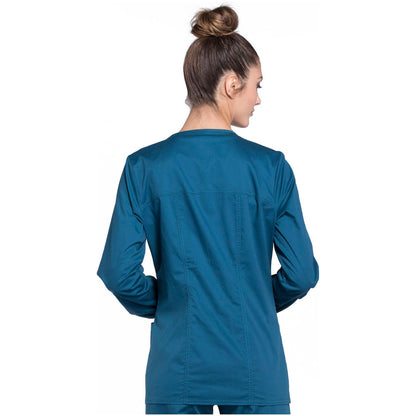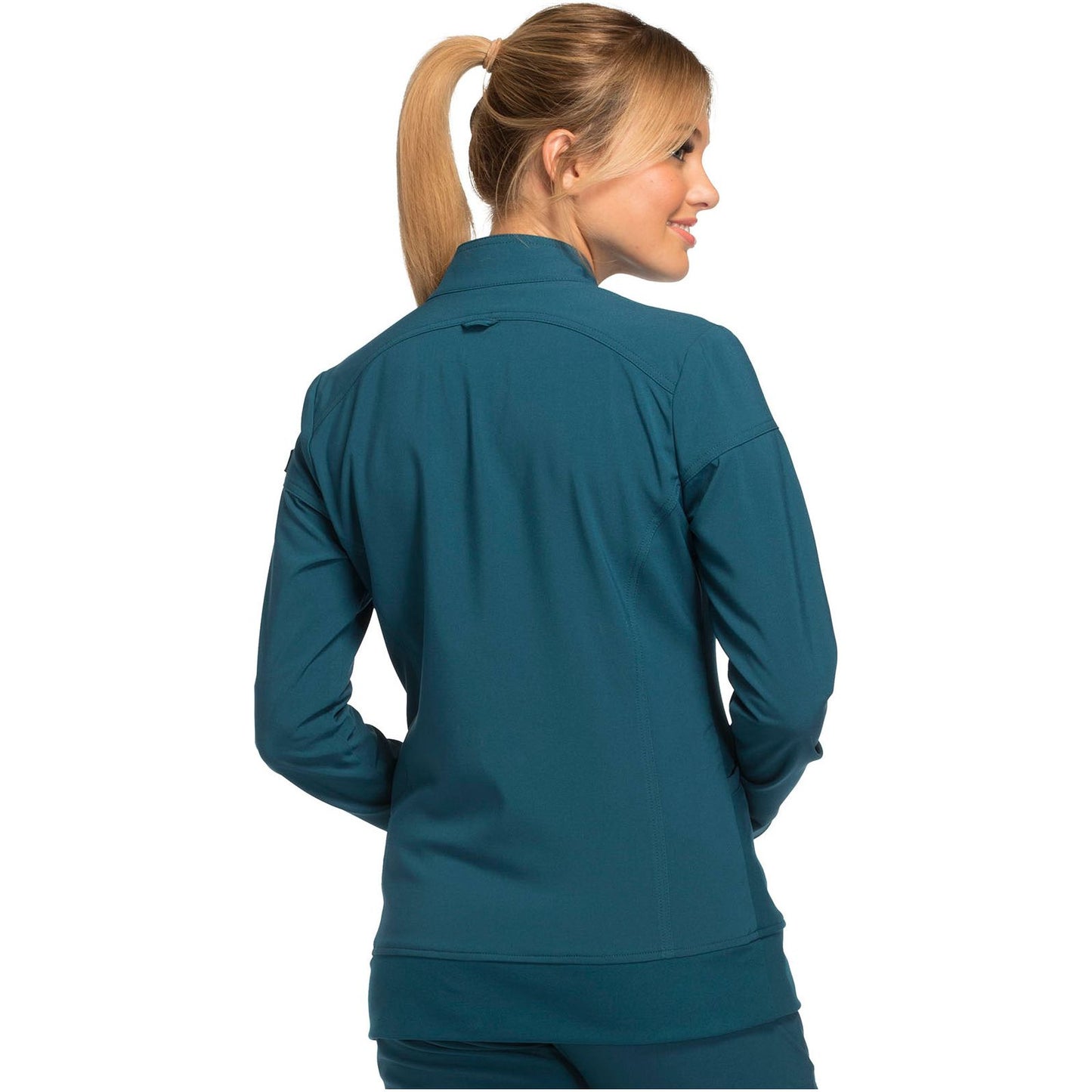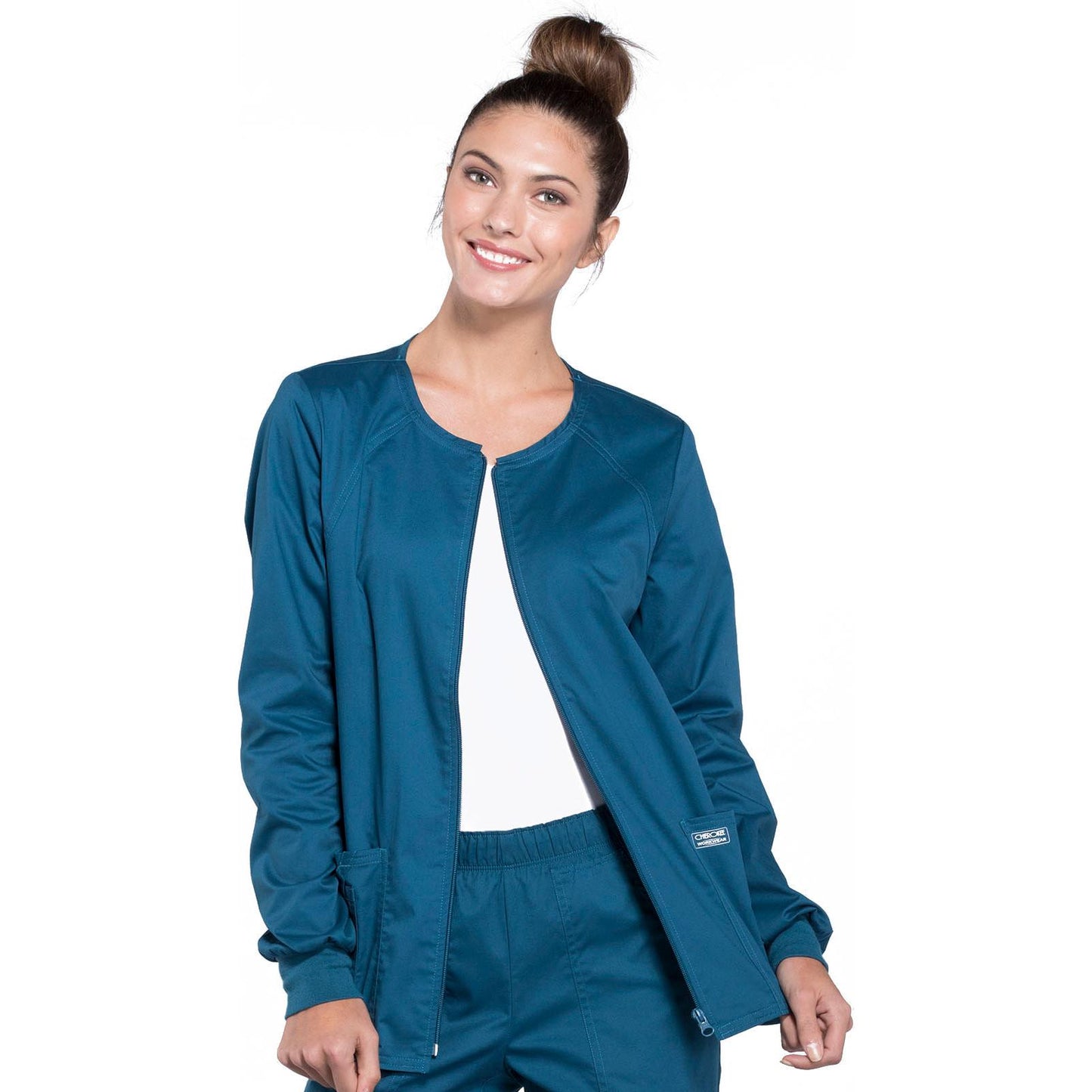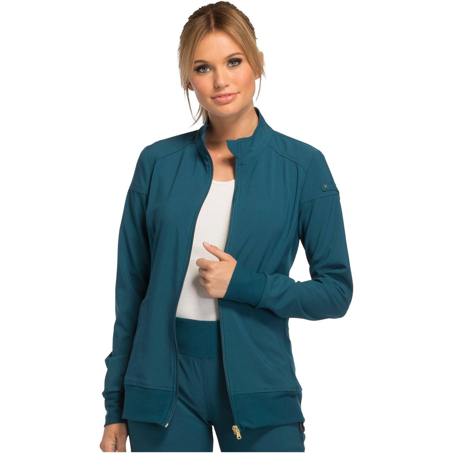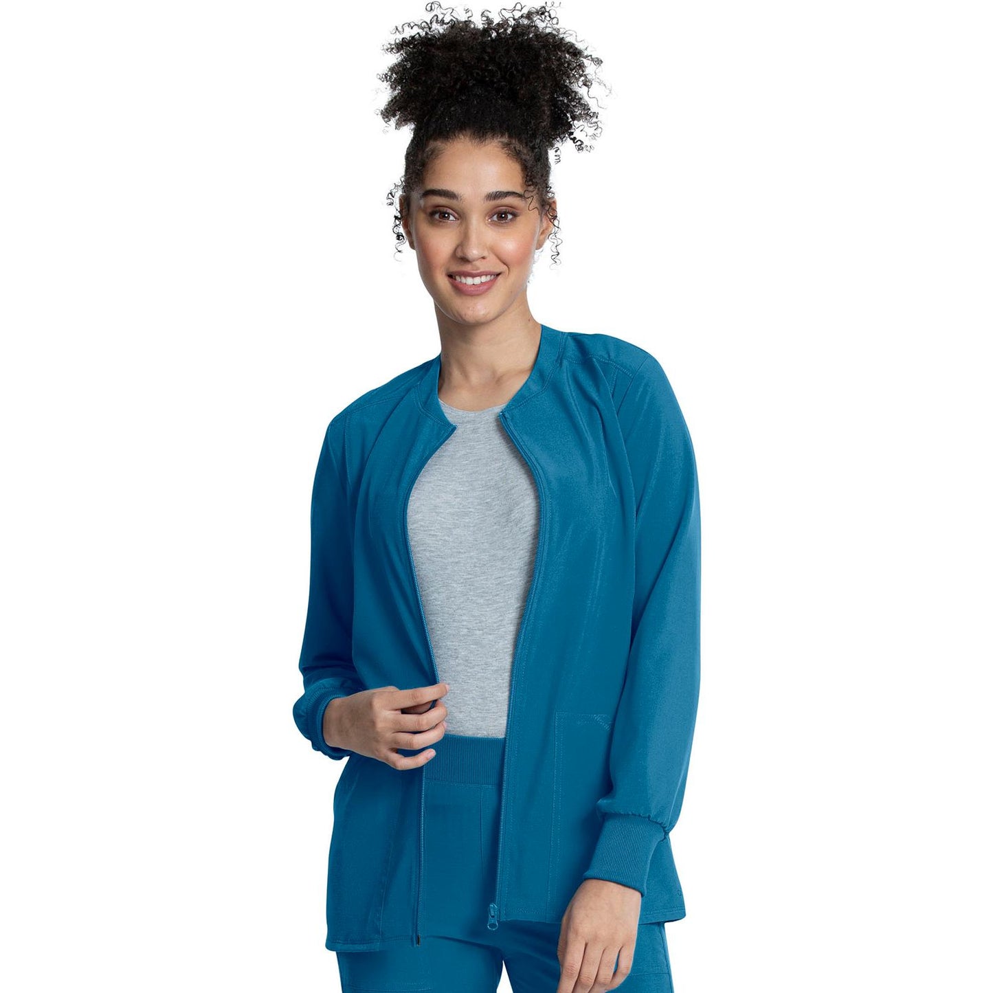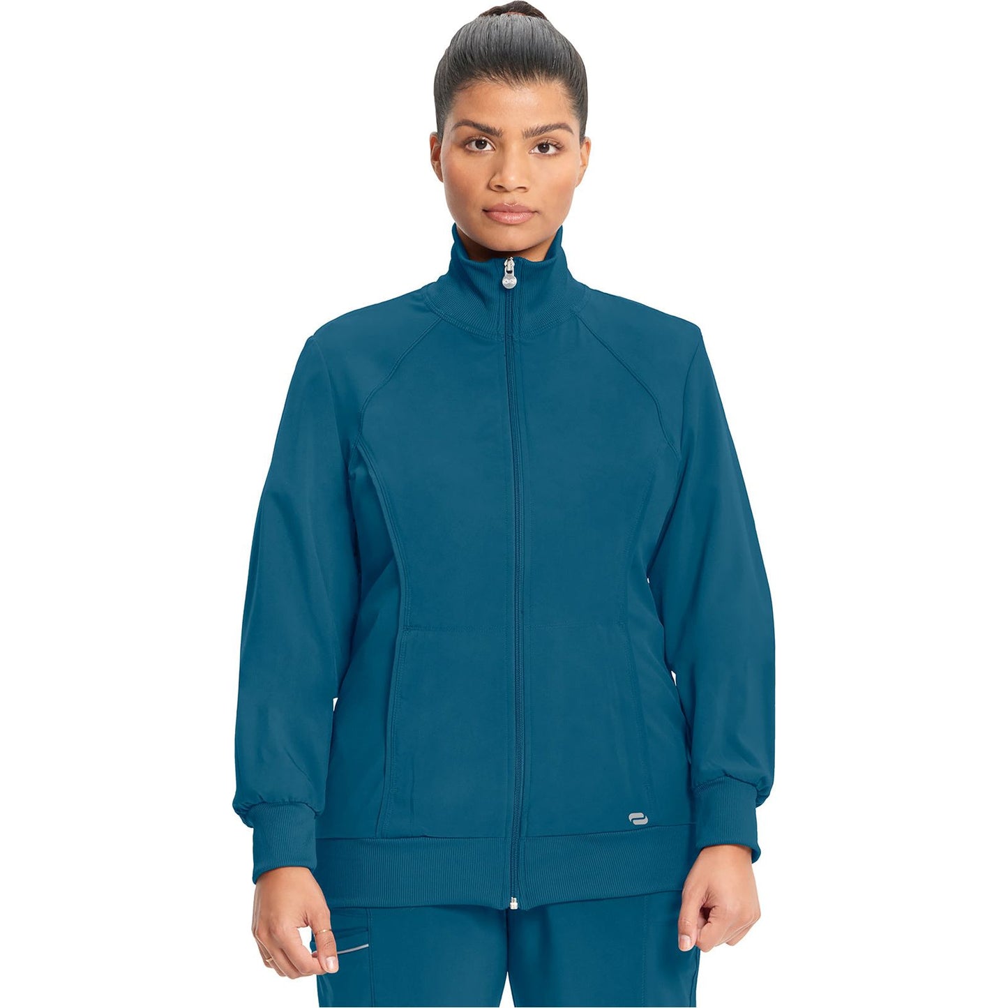 A Contemporary fit, sporty zip front jacket features front and back shoulder yokes, front princess seams with flat piping, hidden pockets with a zipper closure and a logo zipper pull. The back panel, collar, cuffs and waistband are made in a stretch rib knit for extra comfort. Coverstitch detail throughout. Center back length: 26". The comfortable stretch poplin fabric and super stretchy rib knit is the perfect combo for healthcare professionals.