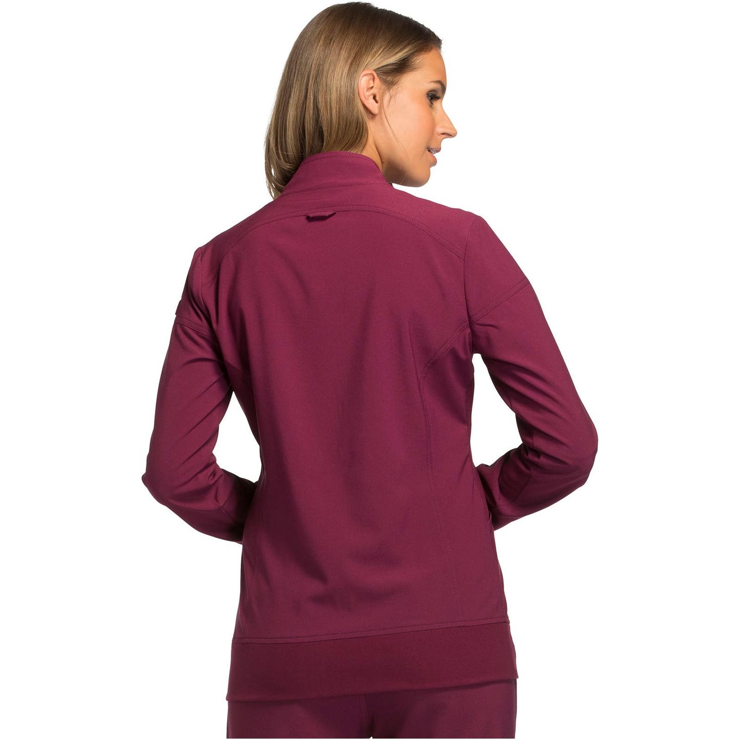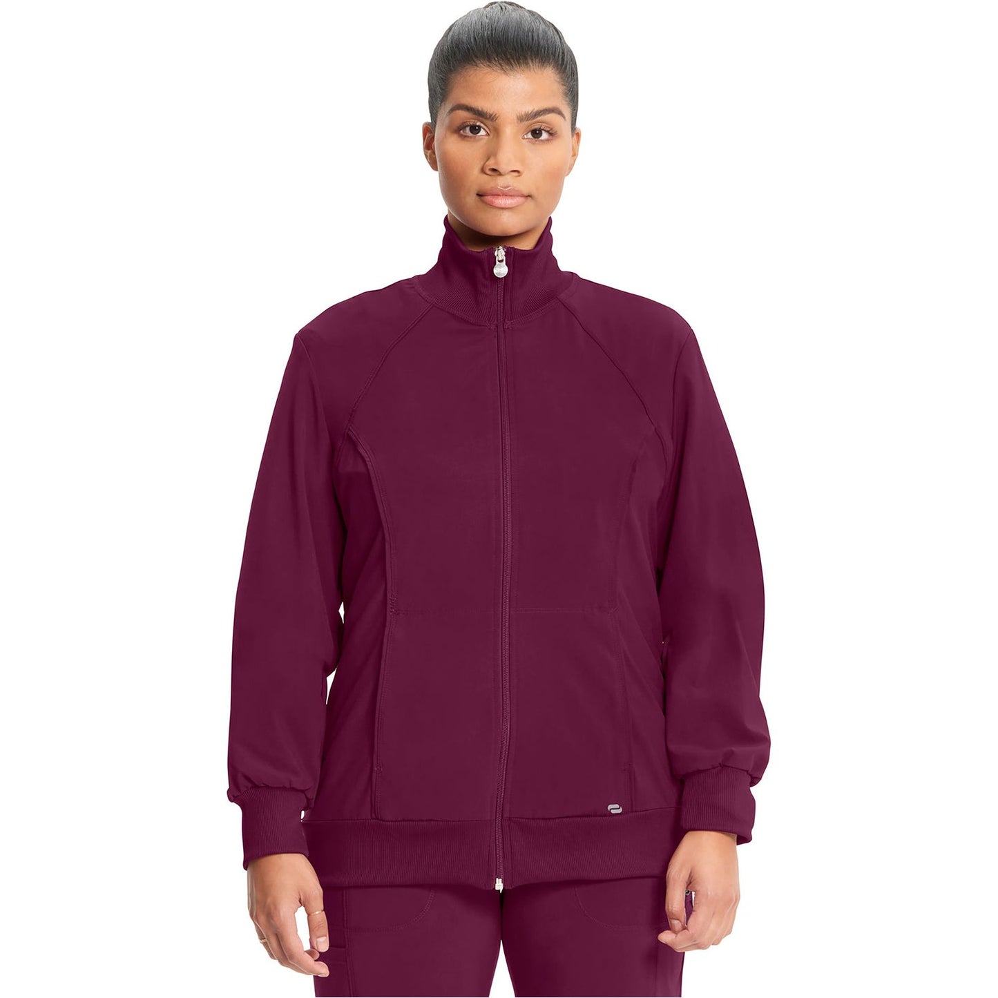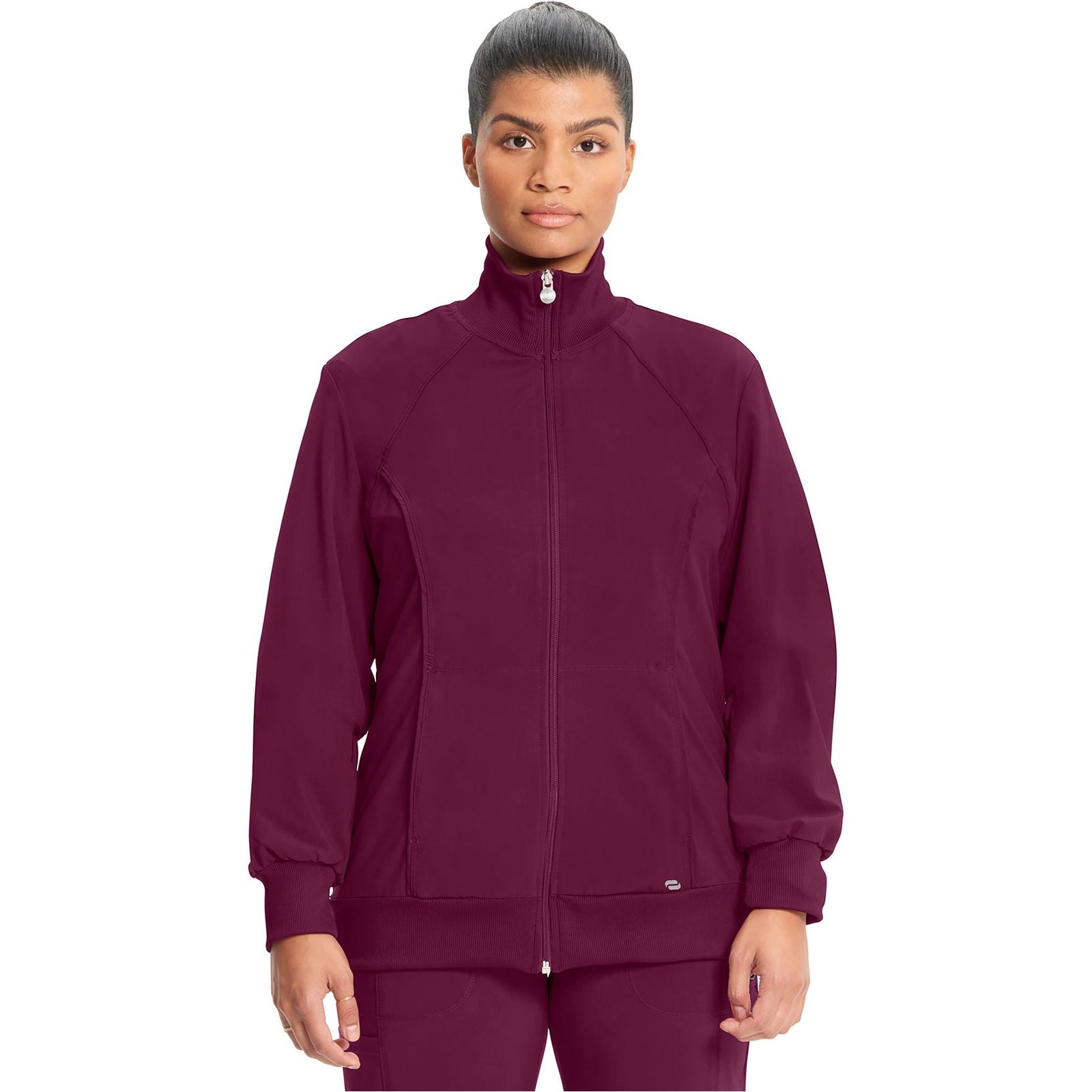 A Contemporary fit, sporty zip front jacket features front and back shoulder yokes, front princess seams with flat piping, hidden pockets with a zipper closure and a logo zipper pull. The back panel, collar, cuffs and waistband are made in a stretch rib knit for extra comfort. Coverstitch detail throughout. Center back length: 26". The comfortable stretch poplin fabric and super stretchy rib knit is the perfect combo for healthcare professionals.