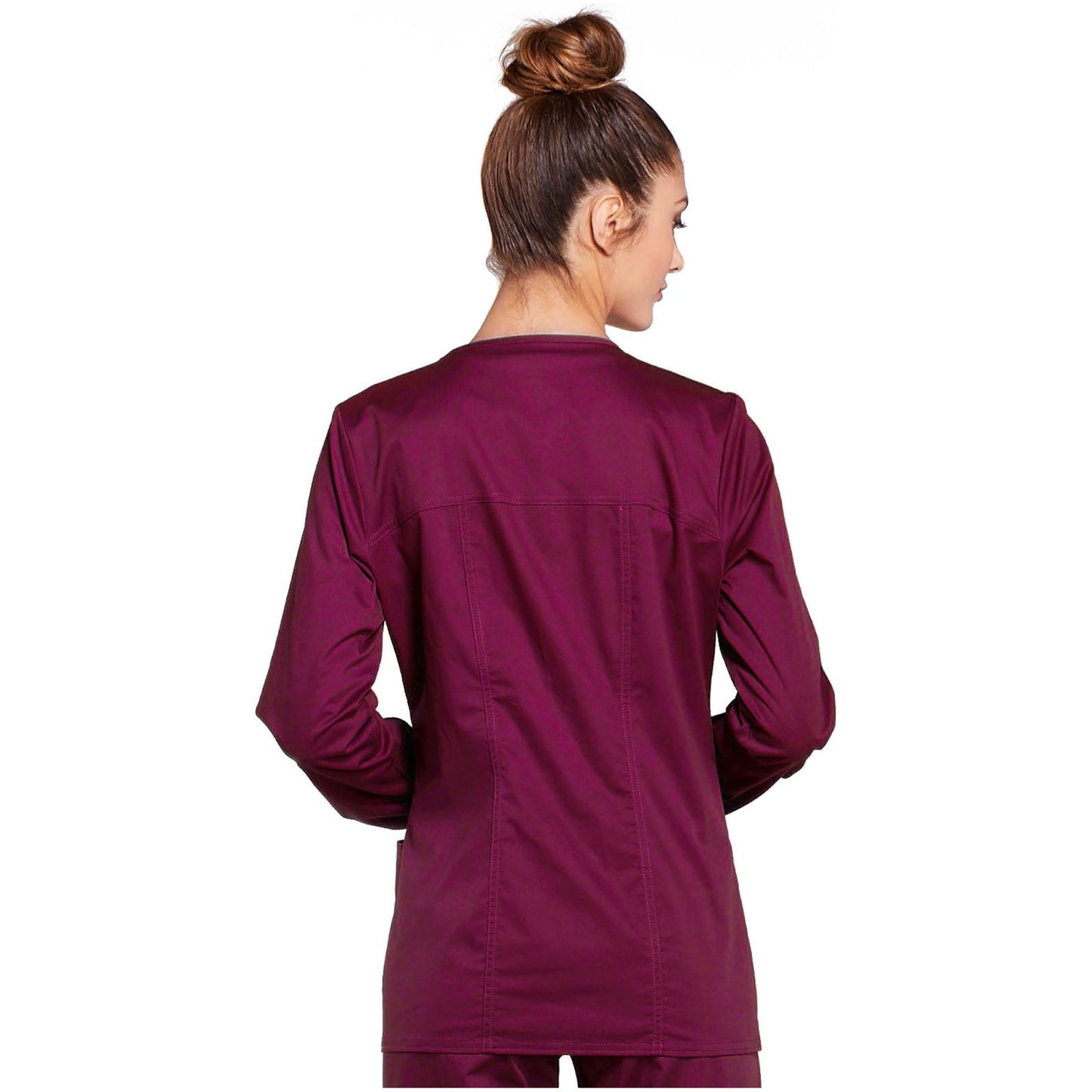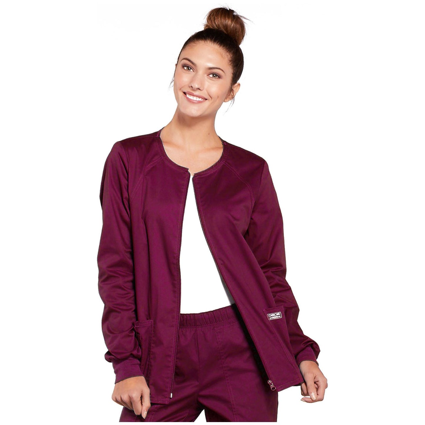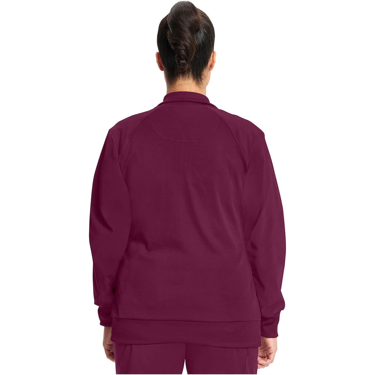 A Contemporary fit, sporty zip front jacket features front and back shoulder yokes, front princess seams with flat piping, hidden pockets with a zipper closure and a logo zipper pull. The back panel, collar, cuffs and waistband are made in a stretch rib knit for extra comfort. Coverstitch detail throughout. Center back length: 26". The comfortable stretch poplin fabric and super stretchy rib knit is the perfect combo for healthcare professionals.